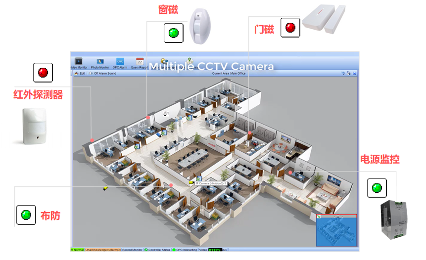 安防集成监控管理系统用于监控各个门禁点的状态、显示刷卡记录、刷卡人照片、远程开门操作、设置开门计划和OPC联动,该管理系统具备实时视频联动,图像抓拍,记录监控,防区管理,人员跟踪等功能。